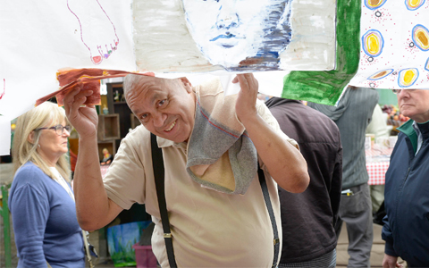 Sniffin' Diamonds, Cutting Glue is a treasure chamber on wheels. In public space it can be moved around from place to place. Jonathan Fuller-Rowell elaborated the construction. In the midst of all the hustle and bustle Klaus E. Dietl and Stephanie Müller try to create and maintain a kind of protective atmosphere. Passers-by are invited to enter the chamber and bring along insecurities and reservations. Dietl and Müller listen carefully to the ones who entrust them with their concerns. Then they start to transform their fears, their problems – everything that's usually immaterial and not tangible, everything that keeps us from reflecting and acting - into a piece of take-away artwork. Step by step the interior of the cosy chamber, each piece of art, will be deconstructed in order to create something for the people. Let's rip it up and start again.